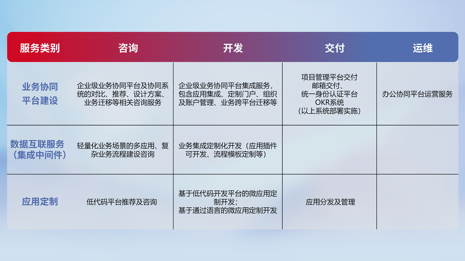 针对钉钉、、、企微、、、IDaas等平台级产品提供产品的规划、、方案、、交付、、定制化开发等服务,,,,实现如统一协同办公、、智能客户服务、、、混合会议管理、、、智能数据查询、、等业务场景,,,实现数字化转型。。